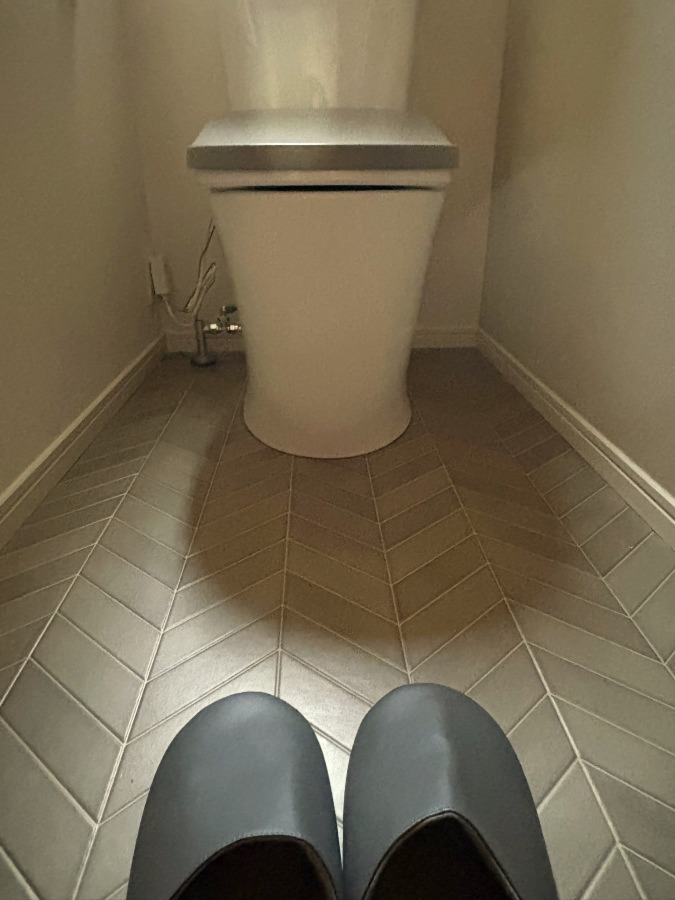 今回のトイレは、北欧テイストのヘリンボーン床と木目の収納を組み合わせ、和の要素も取り入れたジャパンディスタイルに仕上げました。