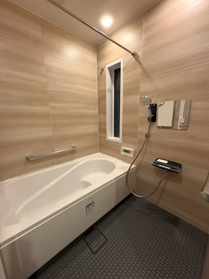 LIXILリデア1616を採用。壁パネルは〈クオーレポプラ〉を全面張りにし、やわらかな木目で空間を包み込むような仕上がりに。浴槽はルフレトーンのホワイトを選び、清潔感とお手入れのしやすさを両立しました。床はキレイサーモフロア〈グラニットグレー〉で足元の冷えを軽減。ブラックのワイドレバー水栓やシャワーフック、メタル握りバーが空間を引き締め、落ち着きのあるスタイリッシュな浴室に。ルーバー窓からFIX窓へ変更し、断熱性も向上しています。