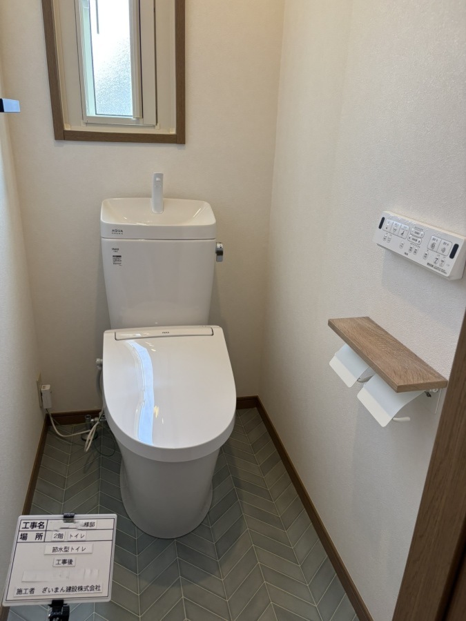 2階トイレにはLIXILアメージュ+シャワートイレKAを採用。内装は木目の天井クロスを取り入れ、床は1階とは色違いのブルー系タイル柄でコーディネートしました。やさしい色合いでまとめた北欧風の落ち着いた空間に仕上げ、「気持ちよく使えること」を大切にしたトイレです。階ごとに雰囲気を変えつつ、住まい全体の統一感も意識しています。