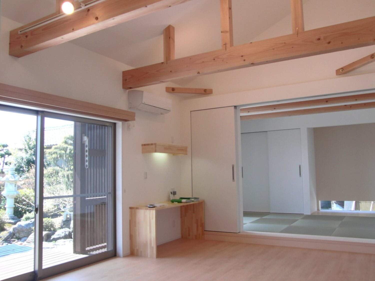 大きな窓から取り込む庭の景色や、梁を見せた開放的な天井が印象的なLDK。