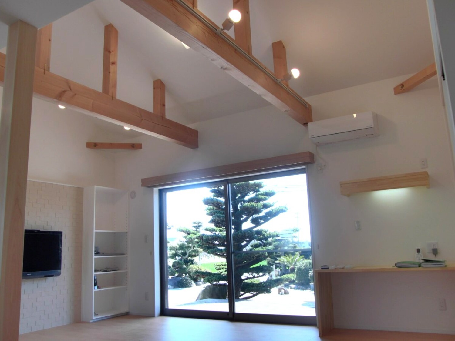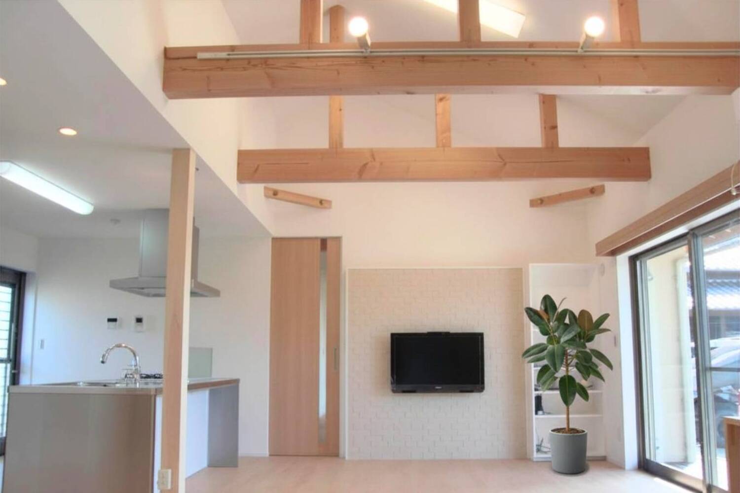 - LDK|梁と吹き抜けが心地よい平屋のリビング空間