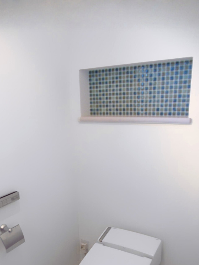 窓のないトイレ空間に、ガラスモザイクタイルを取り入れたニッチを設けることで、光を感じるような明るさと軽やかさを演出しています。