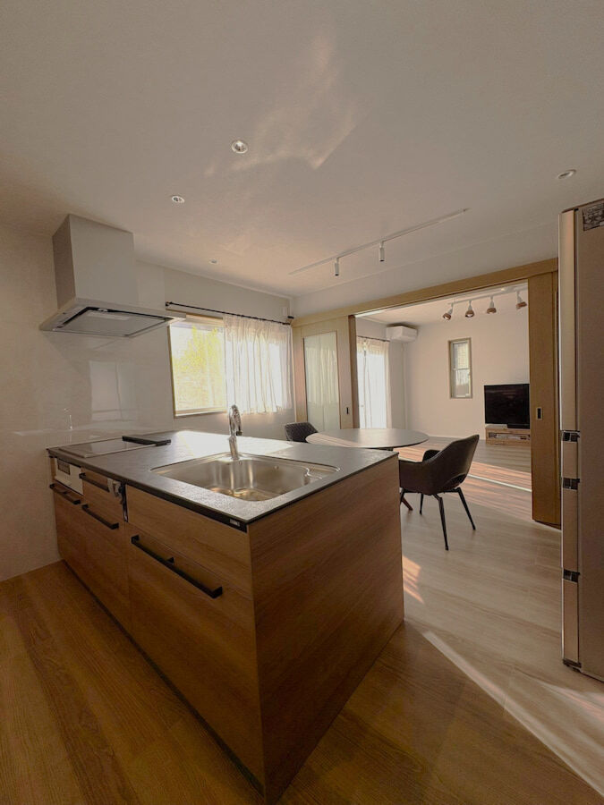 O様邸では、チェリー柄のキッチンを中心に既存の建具や張り替えた床、家具の色合いまで丁寧に整えることで、空間全体に自然な統一感が生まれました。